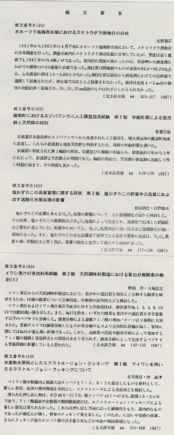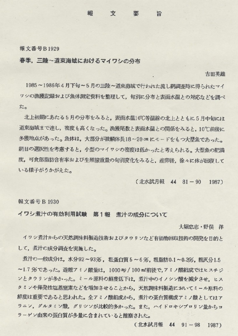 標題:イワシ煮汁の有効利用試験 第3報 天然調味料製造における限外ろ過膜の検討著者:大堀忠志・野俣洋