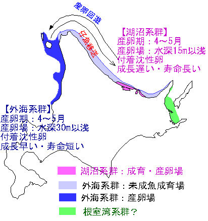 外海系群:日本海で生まれ、オホーツク海で着底後、成熟とともに再び日本海へ産卵のため回遊します。