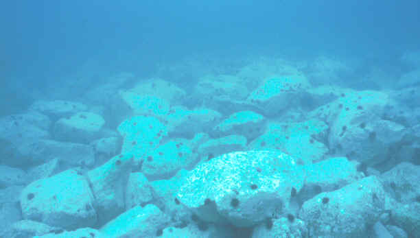 黒い点に見えるのはキタムラサキウニで、石の表面が白くなっているのは無節サンゴモに被われているためです。