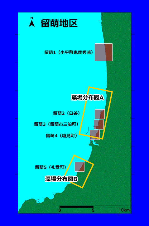 その後、留萌市三泊漁港付近でも小規模ながら、フシスジモク群落で卵が発見され、平成10年は留萌市~小平町臼谷の広い範囲でニシンの産卵を確認することができました。