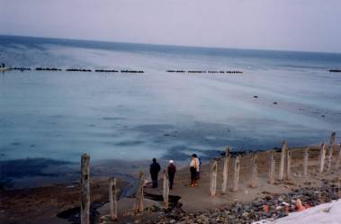 平成10年3月17日、まずは18日予定の港内での潜水調査の下見を兼ねて、河口域の北東側に位置する港内潮見地区の岸から胴付き長靴を着用して卵探しをしてみました。