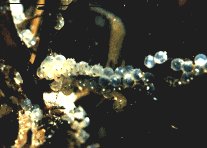 間もなく海藻調査歴20年のN主任に呼ばれ、急いで駆けつけてみると、箱メガネで海中を覗いていたその人は「そこについている白っぽいの、ニシンの卵じゃないか。」といいます。半信半疑で箱メガネを奪い、海中を覗き、目を凝らすと、おお、水深僅か0.7メートルに生育するスガモの細い葉上にぽつぽつと半透明の丸いものが数個付着していて、手に取るとニシン卵のようです。周辺を探すと、ぽつぽつは広い範囲にあることがわかりました。しかし、風波もでてきたのでその日はそこで作業を中止しました。
