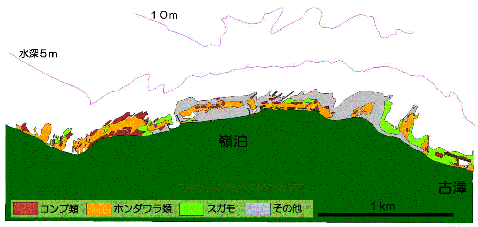ニシンの産卵については、これまでにも多くの報告がありますが、それらは春ニシンと呼ばれた「北海道・サハリン系群」についてであり、現在調査を進めている地域性ニシンについてはあまり知見がありませんでした。 平成9年から実際にどのような場所に産卵しているかを潜水や岸からの観察で調べてきましたが、平成10年の春にやっと産卵場を見つけることができました。それが厚田村嶺泊の平磯です。比較的浅い場所のスガモやフシスジモクに多くの卵が産みつけられているのを発見しました。それ以降、石狩管内を中心にいくつかの地区で産卵床が確認されていますが、毎年、ニシンの産卵床が確認されている数少ない場所です。