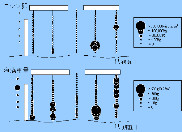 船浜地区の水深0.5~3メートルのスギモク,フシスジモク,アカモクなどのホンダワラ類を中心とする藻場にニシン卵が産み付けられていた。