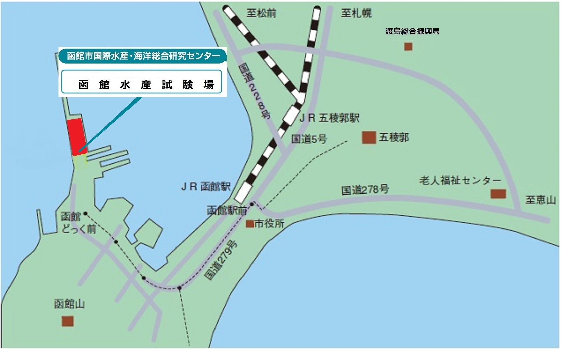 交通案内 住所 〒040-0051 北海道函館市弁天町20番5号函館市国際水産・海洋総合研究センター内 函館駅から 市電 函館駅前発 函館どつく前行 市電約15分 函館どつく前下車 徒歩約15分 車 タクシー約15分 函館空港から バス 函館空港発 函館バス 96系統函館駅前行 約20分 函館駅前下車上記市電に乗り換え 函館空港発 函館帝産バス 市内シャトルバス 約20分 函館駅前下車上記市電に乗り換え 車 タクシー約30分