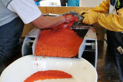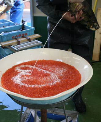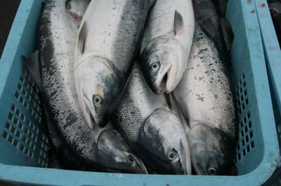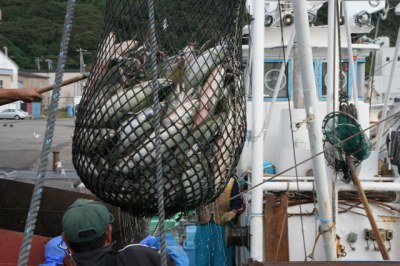 定置網で漁獲され、船倉から市場へ出荷されるサケ