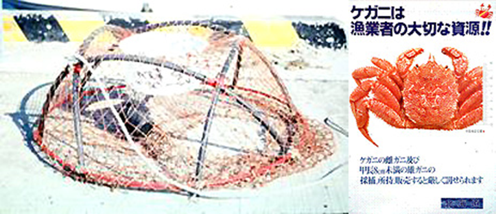 ケガニ資源調査は、かにカゴを用いて行っています。かにカゴで漁獲されたケガニの数と大きさから、資源の状態を把握します。