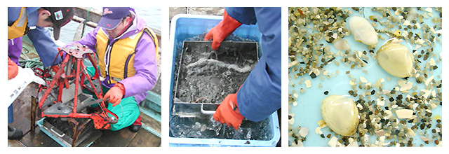 採泥器(0.05平方メートル)を用い底砂泥を採取・ふるいにかける・ホッキ稚貝発見!