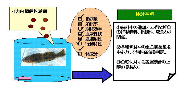 本研究は、工業試験場、釧路水産試験場、東京海洋大学、当水試の4機関が共同で行います。栽培水試では、イカ内臓飼料の養魚用飼料としての有効性に関する実証試験を担当します。