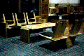 間伐材を用いた学校用机・椅子Cタイプ School furniture ( desks and chairs for class room )C type 材種:カラマツ材 Cタイプは天板に樹脂を含浸させて傷がつきにくいこと。椅子のスタッキングが可能であること。もの入れに椅子を差し込んで移動が可能なこと等の特徴があります。 |