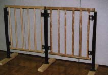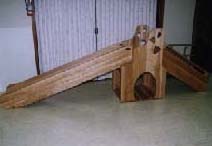 療育すべり台 材種:ナラ 肢体の不自由な児童用に開発した木製すべり台です。手すりには木材・金属複合パイプを使用し、握りやすい太さと暖かい手触りを実現しています。階段の段差が小さく、すべり台の傾斜も緩やかな安全設計となっています。また、全体を3つに分割することができるため、移動も容易です。 |