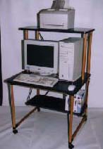 複合パイプを用いたパソコンラック 材種:カバ等 全ての骨組みに木材と金属の複合パイプを使ったパソコンラックです。背面の細いブレスは、外形9mmの金属丸棒に0.2mmの単板を3周巻き付け、他の部品には外径25mmのパイプに0.5mmの単板を2周巻き付けています。17インチモニターとタワー型パソコンを並べて置けるサイズです。また、ジョイント部分の金具には組立が簡単な市販品を採用し、コストダウンを図っています。 |