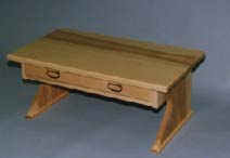 ロシア産キカンバ材を用いた文机 材種:キカンバ 林産試験場では1992年度から実施されている「北海道とロシア連邦極東地域との経済協力プログラム」の一環として、ロシア産キカンバの材質および加工適性について試験を進めてきました。キカンバは心材の変色や腐朽の発生が著しく、利用が難しい材ですが今回試作した文机は良好な仕上がりでした。今後、家具などへの用途拡大が期待されます。 |