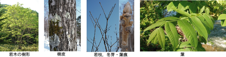 温帯の適潤地に生える落葉樹。雌雄同株。花芽が雌雄別々の単性花。高さ30m,太さ1m近くになる。樹皮は,小径木では灰白色で比較的平滑,太くなると暗褐色(よく白斑が混ざる)になり縦に深く裂ける。枝は,灰褐色で開出する。1年生枝は1~1.5cmと太く,せん毛が密生する。若枝には猿面形あるいはT字形の大きな葉痕が隆起する。冬芽は裸芽で外側の1対の葉が芽鱗の役目をはたす。頂芽は円錐形で長さ1.5cmほど。葉は,互生し,奇数羽状複葉で葉柄を含めた長さは70~80cmにもなる。小葉は4~10対,中央部ほど大形で長さ10cm幅4cmほど。雄花は緑色で,太いひものような20cmほどの穂が数本垂れ下がる。雌花は紅色で,10~20個を疎生させた穂が斜上する。果実はほぼ球形で直径3~4cm,中に堅い核果をもつ。