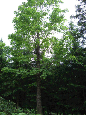 |  名称  和名:ハリギリ 別名:センノキ,セン(木材として流通時は別名が一般的) アイヌ語名:アユシニay-us-ni(トゲの多くある木) 漢字表記:針桐,栓の木 英名:Caster aralia,Sen 学名 Kalopanax pictus Nakai 分類 ウコギ科ハリギリ属 分布 日本,南千島,サハリン,中国,朝鮮半島 生態・形態 平地~山地中腹,段丘上などの肥沃な土地を好む落葉性の高木。ミズナラ,イタヤカエデ,シナノキ等の天然林やトドマツ人工林内等に点在し,純林や優占種となることはほとんど無い。ハリギリの名は,若い幹や枝にトゲが多く,白い材色がキリに似ることから。 高さ25m,直径1mを超えるものもある。寿命が長く,太い枝を持つ壮大な樹形となる。樹皮は厚くて荒く,灰褐色~暗黒褐色で縦に深く割れる。硬く鋭いトゲは成長につれ目立たなくなり,大径木の幹には小さな突起状に残る程度。一年生枝はとても太い。 葉は大型で長さ,幅ともに30cm近くになり,長い葉柄を持つ。葉身は5~7片の掌状に深く裂けて先端は鋭くとがり細かい鋸歯を持つ。5月下旬頃,大きな頂芽から10枚以上が一斉に開葉する。葉は枝の先端部に多く,下位の短枝上には1~5枚程度の葉がつく。 両生花は8月頃開花する。花弁は淡緑色で小さいが,複数の散形花序が大きな穂状に咲くのでよく目立つ。果実は直径5mm程度で10月頃黒く熟し,球状にまとまってつく。  |