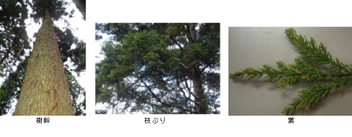 長寿で,高さ50m,太さ2m(まれに4m)になる。樹冠は円錐形。樹皮は赤褐色から暗赤褐色で縦に細長く裂け,繊維状にはげる。枝はよく分かれ房状になる。葉は,かま状の針形でらせん状に枝(茎)を包む。葉の基部は太く枝と一体状となる。葉色は濃緑色。冬期,茶褐色となることがあるが春には戻る。葉の横断面は菱形で四面に気孔線がある。