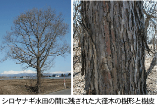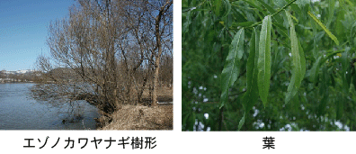 | 名称  和名:シロヤナギ 漢字表記:白柳 学名 Salix jessoensis Seemen 分布 北海道,本州(東北部) 生態・形態 川辺や湿った平原に生え,高さ30m,太さ1mに達し道内のヤナギ属で最も太くなる。群落を作らず,単木的に生える傾向がある。樹皮は帯褐灰色で縦に細く割れ目ができ薄く剥がれる。「柳に枝折れなし」の格言に反し1年生枝の分岐点がもろく,きわめて折れやすい。葉は長楕円形から被針形,先がとがり基部は鋭形または鈍形,縁に細鋸歯がある。表面は濃緑色でやや光沢があり,裏面は紛白色。開花は開葉と同時で雌花は淡黄緑色,雄花の葯は黄色,長さ2~5cm。大木になるため記念樹として老木が残されていることも多い。  |