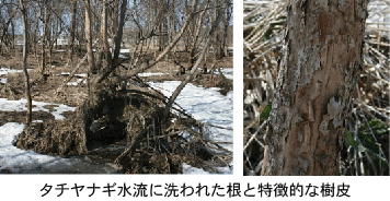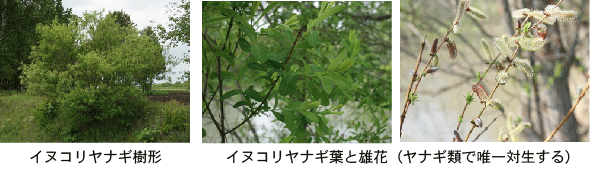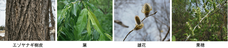 河畔林に多く生え,初期成長が早く高さ30m,太さ60cmになる。樹皮は深く縦裂し鱗片状に剥がれる。枝先が垂れる。葉はエゾノバッコヤナギと似るが,下面が無毛。雄花は8cm,雌花は10cmに達する太く長い花穂を垂下する。