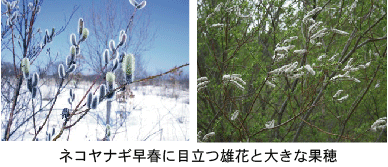 | 名称  和名:ネコヤナギ 別名:カワヤナギ(川柳),エノコロヤナギなど 漢字表記:猫柳 学名 Salix gracilistyla Miq. 分布 北海道,本州,四国,九州,朝鮮,中国,ウスリー 生態・形態 川の縁など水に近いところに普通に生え,高さ3mほどになる低木。若葉は表面にも灰白色の軟毛があり,裏面は灰白色の絹毛を密生する。成葉は革質,長楕円形で先はとがり,微鋸歯縁,長さ7~13cm,幅1.5~3cm,裏面は絹毛をやや密生する。ヤナギ類で最も早く,道北地方ではかなり積雪がある時期,開葉前に大きめの花を付け,雄花は長さ3~6cm,葯は初め紅色,花粉が出た後は黒くなる。雌花は2.5~4.5cm,果穂は花後伸びて9cmに達する。  |