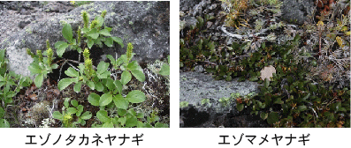 |  ○その他のヤナギ類 このほかに低木の高山性ヤナギ類として次の4種がある。 ・エゾノタカネヤナギ Salix yezoalpina Koidz. 利尻島と大雪山の高山帯に生える。 ・ミヤマヤチヤナギ Salix paludicola Koidz. 大雪山系の湿地にはえる固有種。 ・ヒダカミネヤナギ Salix hidakamontana Hara 日高山系,夕張山系から報告があるが分布の詳細は不明。 ・エゾマメヤナギ Salix pauciflora Koidz. 日本で最小のヤナギで大雪山の固有種。高さ1~2cmしかなく,10円玉と比較してその小ささがわかる(右写真)。  |