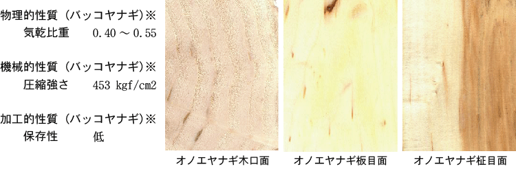 散孔材。各種とも材は軽くて軟らかい。オノエヤナギでは辺心材の境界は不明瞭で褐白色から淡褐色。バッコヤナギでは辺心材の境界はおおよそ明瞭で辺材は白色または黄白色,心材は淡褐色から淡黄褐色。年輪はほぼ明瞭。肌目はおおよそ緻密。