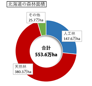 北海道の森林の広さはおおよそ554万ヘクタール。日本の森林の広さのうち20パーセントが北海道にあり、北海道は日本の中でも特に緑の豊(ゆた)かな地域(ちいき)といえます。