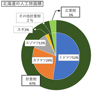 北海道の人工林では、トドマツの森林が一番多く、次に多いのがカラマツです。