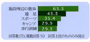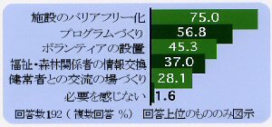 障がいを持つ人たちの森林利用促進に必要な事柄としては、トイレや路面状態、段差の解消といったハード面と共に、森林体験のためのプログラムやボランティアの設置といったソフト面であり、それらの充実が求められています。