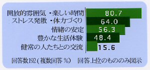 森林での活動は全体の約76%が実施しており、内容としては、遠足などの施設行事と散歩などの日常的な活動があります。また、森林で過ごすことによる効用については、開放的雰囲気の中で楽しい時間を過ごす、体力づくり、情緒の安定といった回答が多い結果でした。