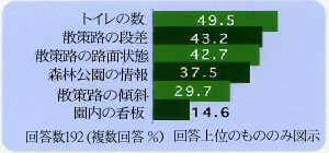 森林公園への配慮事項では、トイレの数、段差、散策路の路面状態、公園の情報、散策路の傾斜に関する回答が多い結果でした。森林利用の支援には、施設のバリアフリー化と共に、森林体験のためのプログラムやボランティア設置など、ハード・ソフト両面からの支援が必要です。