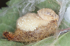 写真4 雌成虫(右)体長13mm、卵塊(左)、繭(下)。新得町、エゾヤマザクラ上、 |