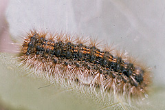 | 幼虫 | 体長最大約3.5cm(写真1)。  ドクガ科の幼虫は腹部第6、7各節背面中央に小突起(背腺)がある。  |