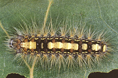 | 幼虫 | 体長最大約3cm(写真1)。 体は黒と黄色、背中に赤いコブが2列に並ぶ。  ドクガ科の幼虫は腹部第6、7各節背面中央に小突起(背腺)がある。  |