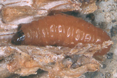| 幼虫 | 体長最大約9mm。体は太く、赤茶色。頭部は茶色で小さい。 |
