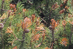 被害と防除  マツ属の重要害虫の1つである;被害は新梢に多く、球果には少ない;被害を受けた新梢は先端10cmほどが赤く枯れる;海岸林として植えられているクロマツ幼齢林にしばしば多発する;庭木や生垣にも被害が多い(文献1984)。高さ1~2mまでに被害が多い(文献1994)。