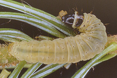 | 幼虫 | 体長最大約20mm。体は黄色から黄緑色、背中に小さな黒点がある。頭とそのすぐ後は黒い。尾端背面はオレンジ色。  トドマツ林ではマツアトキハマキ、タテスジハマキ、クロタテスジハマキなども多発するが、これらの終齢幼虫は体が緑色で、黒い点がない。  |