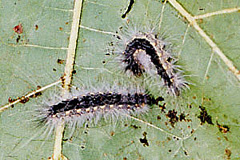 生態 本州では幼虫は6~7月と8~9月に出現する;小さなときは数百頭の集団を形成し、糸を張り巡らし巣をつくる;成長すると巣から離れ、単独で加害する;老熟した幼虫は樹皮の割れ目など隙間に入って、体毛の混ざったうすい繭を作り、繭の中で茶色の蛹になる;成虫の出現時期は春と夏;雌成虫は約500個の卵を葉裏にまとめて産み付ける;蛹で休眠して越冬する(文献2010)。近年、日本の南西部においては年3世代を経過するようになった(文献2010)。