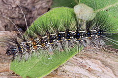 | 幼虫 | 体長最大約50mm。体は地色が黒く、青光りするコブと茶色のコブがあり、背中に白い線が走る。黒い毛と白い毛が混じる。小さな幼虫は黄色。頭部は黒色。幼虫はある程度成長すると体に青く光るコブが現れる。  クロバネヒトリやカクモンヒトリにやや似るが、これらでは頭部は赤褐色。  |