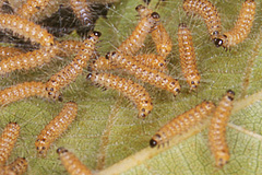 | 状態 | 葉が食べられる、なくなる。枝や葉上に幼虫がみられる。被害木の下の地面に虫糞がある。 秋は主にクワに発生し、葉は黄色になり、糸が密にからむ。幼虫は春には分散して様々な植物を食害するが、糸は張らない。 |