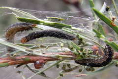 | 状態 | 林が赤く見える。  葉や枝が糸で綴り合わされ、葉の断片や糞が付着する。幼虫や繭がみられる。  |