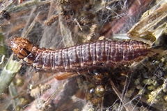| 幼虫 | 体長最大約14mm。頭部は淡い茶色、複雑な茶色の斑紋がある。胸腹部は背面が広く暗い茶色で、淡い縦縞が数対ある。横の縦縞は太い。腹面は広く淡い茶色。  小さな幼虫は緑色。  |