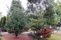 写真1 庭のモンティコラマツの被害。美唄、2009/10/2。  |
