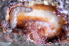 写真3 樹皮下の幼虫(樹皮をはがして撮影)。写真1の被害木。2009/10/2。  |