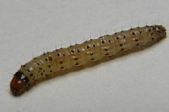| 幼虫 | 幼虫は体長最大約25mm。頭部は赤褐色。胸腹部は灰白色で緑色味または赤色昧を帯び、数本の茶色の縦縞がある。胸部第1節背面は黒褐色。背中に黒い斑点があり、その斑点の部分は盛り上がる。 |