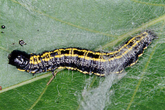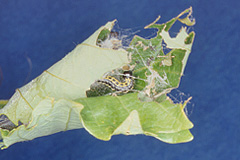 | 状態 | 葉が巻かれて、食べられる。葉は糸で合わされている。葉表を内側にして縦方向の筒状に巻かれる。中に単独ないしは数匹の幼虫がみられる。体長最大約30mm。 |
