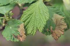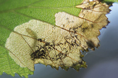 被害など 幼虫の潜葉部位は茶色に枯れて目立つ。まれに森林で発生量が多いことがあるが、実害はない。防除は普通必要とされない。