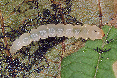 | 状態 | 葉が部分的に淡い茶色になり、その内部に幼虫や糸状につながった糞がみられる。 幼虫は体長最大6mm。 |