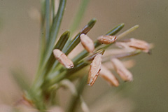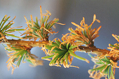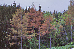 被害など  カラマツ林で大発生する(文献1984・1985)。通常、1~2年で終息に向かう(樹木害虫発生統計資料を参照)。被害は5月頃に目立ち、林全体が赤くなる(文献1985)。しかし、1ヶ月足らずで緑に戻る。食害時期が葉の伸長初期なので、その後、食べ残された根元の緑の部分が伸びてくる。また、5月末からは長枝葉が展開する。