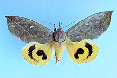 | 幼虫 | 体長最大約75mm(写真1)。体は黒色、茶色、または緑色。背中に2対の目玉模様がある。刺激すると体を曲げて、目玉模様のある部分を突き出し、尾端を上げる。 |