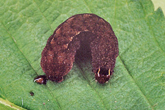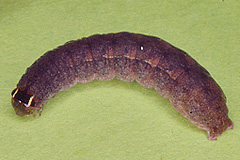 | 幼虫 | 体長最大約40mm。色彩は中~終齢の間で変わらない。類似種との区別点として、腹部2~6節の各節後方の背面両側に三角形の褐色斑があり、また、その斑紋の側縁は黄褐色であること、肛上板(腹端の背面)がほぼ一様な色調であることがあげられる。 |